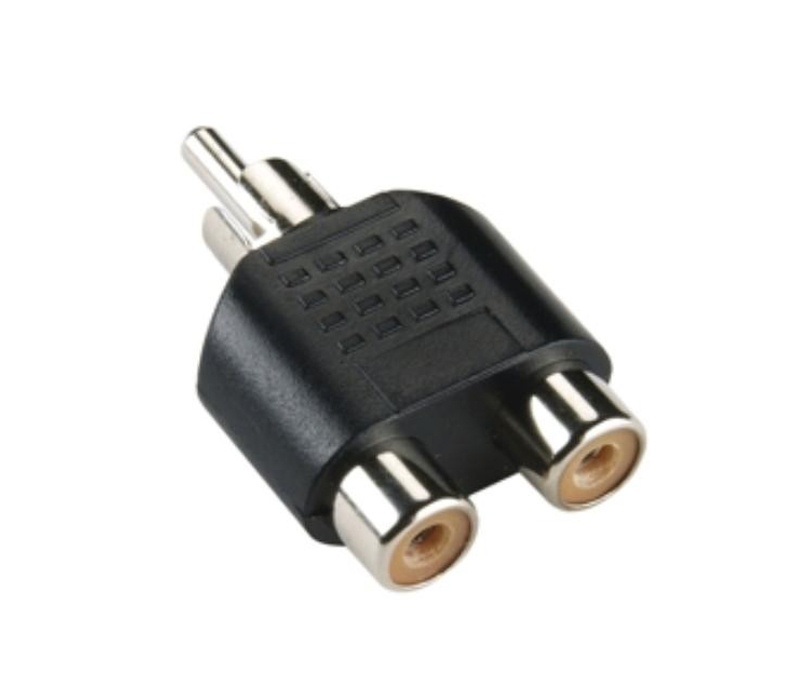 Adaptador de 2 conectores RCA hembra a 1 conector RCA macho.